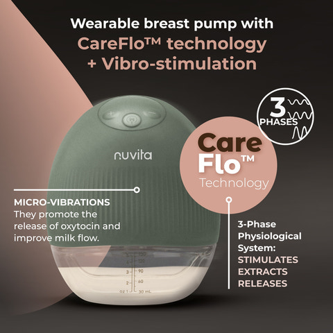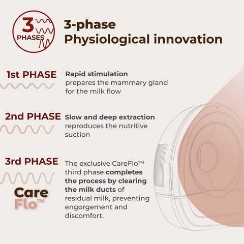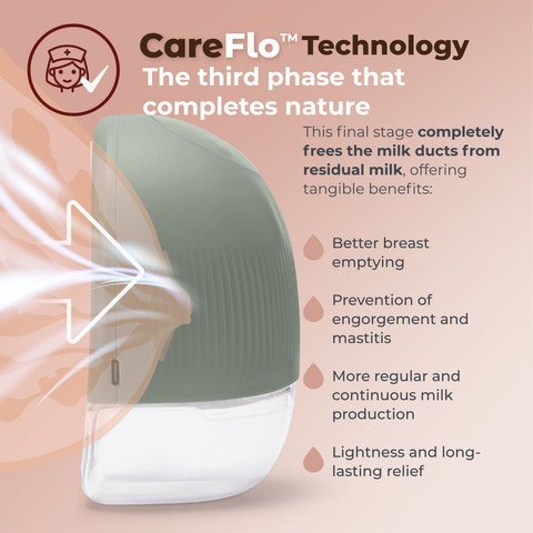 CareFlo™ er Nuvitas eksklusive teknologi, der tilføjer en tredje dræningsfase til den klassiske tofasede pumpning (stimulering + udmalkning). Denne sidste fase er udviklet i overensstemmelse med anbefalinger fra Verdenssundhedsorganisationen og IBCLC-certificerede ammevejledere og renser mælkekanalerne fuldstændigt for resterende mælk, hvilket hjælper med at forhindre mælkeophobning og mastitis. Derudover understøtter den mælkeproduktionen og letter opretholdelsen af eksklusiv amning.