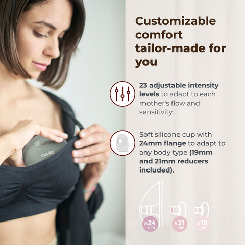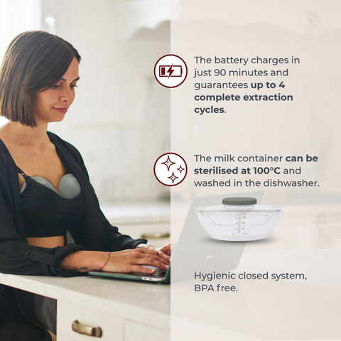 Den ergonomiske kop er lavet af blødt silikone, der er skånsomt mod huden, med en 24 mm flange, og pakken indeholder allerede 2 indsatser (19 mm og 21 mm), der passer perfekt til alle bryster. Materno Flow er støjsvag, let og kompakt med en integreret motor og kan bæres diskret under tøjet – ideel til brug i hjemmet, på rejser eller til daglige aktiviteter.