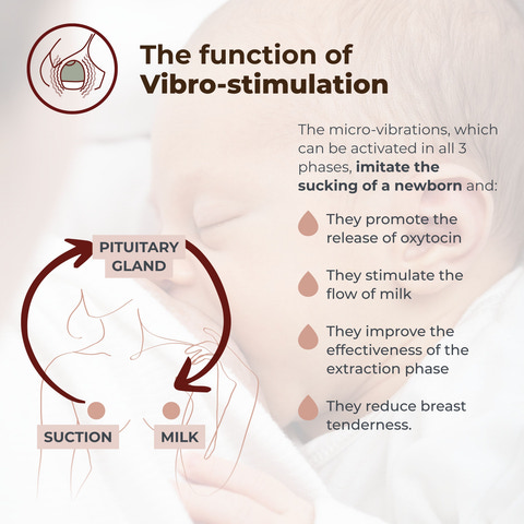 Denne innovative funktion efterligner babyens hurtige sugning i begyndelsen af amningen ved at påføre brystet blide, rytmiske mikrovibrationer. Det fremmer afslapning, letter åbningen af mælkekanalerne og udløser frigivelsen af oxytocin, det hormon, der stimulerer mælkeflowet, for en mere effektiv, hurtigere og behagelig pumpning. Frigivelsen af oxytocin hjælper også med at reducere stress, forbedre vævets iltning og understøtte brystets generelle fysiologi.
