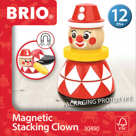 30490 Magnetisk stableklovn vil uden tvivl bringe glæde og grin hos de mindste. Klovnen er malet i klassiske BRIO-farver og er fremstillet af FSC®-certificeret (FSC-C111262) bøgetræ med integrerede magneter, som sikrer ubekymret leg. De fem magnetiske dele kan stables i vilkårlig rækkefølge til udviklingsfri leg eller mønstrene kan matches og give barnet en tilfredsstillende følelse af præstation og glæde.