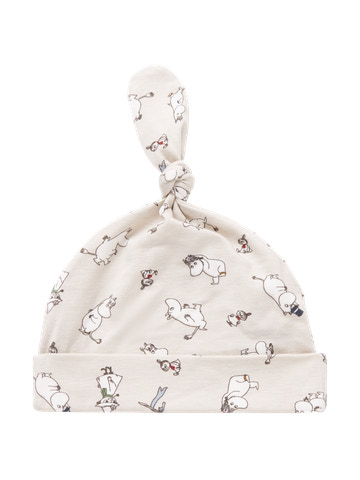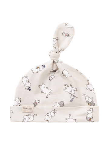 Lille hue med Moomin print til nyfødt med kant der kan foldes ned og med en sød knude på toppen. Huen er både blød, strækbar og behagelig at have på.