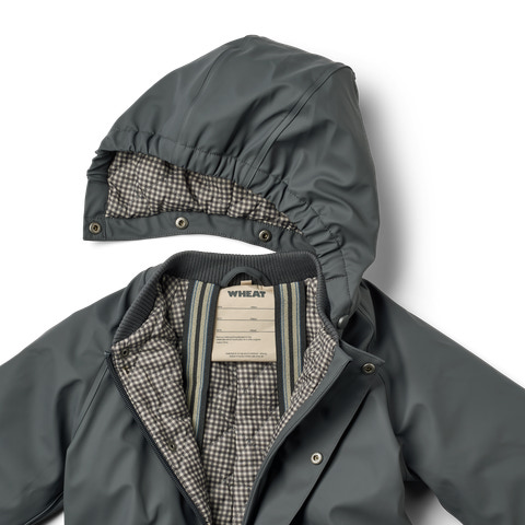 Denne termo regndragt til børn er åndbar, vandtæt og har let polstring, hvilket gør den perfekt til det evigt skiftende vejr. Wheat's populære termo regndragt er en sand vinder i dit barns garderobe. Dragten er lige, hvad dit barn har brug for som overgangsdragt, når sæsonen skifter. Dragten er i åndbart polyurethan (PU) materiale og er unik, da den holder dit barn både tørt og varmt på en og samme tid.