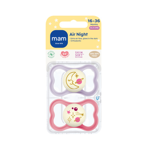 MAM Air har en flad, symmetrisk sugedel og ekstra store lufthuller, så barnets følsomme hud kan ånde. Det specielle design gør også, at forældrene kan se barnets smil, selv når sutten er i brug. Sugedelen er lavet af silkeblød silikone, MAM Skin SoftTM-silikone som føles blød og velkendt ligesom mors hud og accepteres af 94% af alle babyer*. Med sin selvlysende knop er MAM Air Night let at finde i mørket - for lidt lettere nætter. Vi ønsker det bedste for din baby og vores planet. Derfor er skjoldet, knoppen og steriliseringsboksen fremstillet af biocirkulære materialer**.