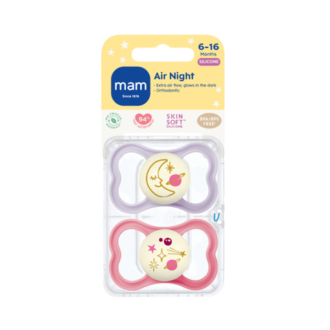MAM Air har en flad, symmetrisk sugedel og ekstra store lufthuller, så barnets følsomme hud kan ånde. Det specielle design gør også, at forældrene kan se barnets smil, selv når sutten er i brug. Sugedelen er lavet af silkeblød silikone, MAM Skin SoftTM-silikone som føles blød og velkendt ligesom mors hud og accepteres af 94% af alle babyer*. Med sin selvlysende knop er MAM Air Night let at finde i mørket - for lidt lettere nætter. Vi ønsker det bedste for din baby og vores planet. Derfor er skjoldet, knoppen og steriliseringsboksen fremstillet af biocirkulære materialer**.