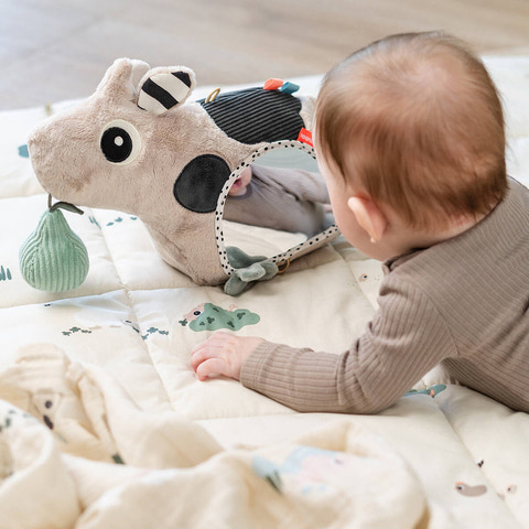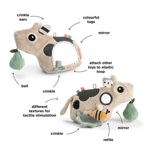 Aktivitets gulvspejl Dotti Sand fra Done By Deer er det perfekte legetøj til de mindste, der både underholder og stimulerer sanserne. Spejlet er formet som den søde ko Dotti og har et blødt, plysset ydre, der indbyder til kram og leg. Spejlet på siden giver barnet mulighed for at udforske sit eget spejlbillede, hvilket styrker selvopfattelsen og nysgerrigheden. De farverige detaljer og forskellige teksturer på Dotti inviterer til at røre, mærke og undersøge, og de små bånd og knuder er perfekte til små fingre, der vil gribe og trække. Gulvspejlet kan bruges både til mave- og rygtræning, og det står stabilt på gulvet, så barnet trygt kan lege. Dotti er designet med fokus på både sikkerhed og udvikling, og det bløde materiale gør det behageligt for barnet at ligge op ad. Med Aktivitets gulvspejl Dotti Sand får du et legetøj, der kombinerer leg, læring og tryghed på én gang. 28 x 11,5 x H 23 cm.