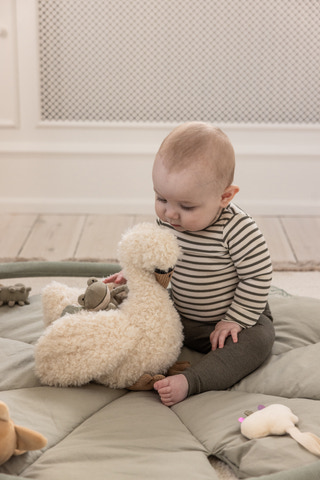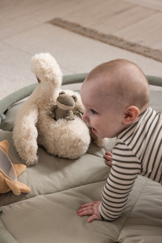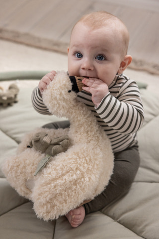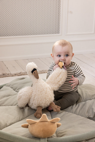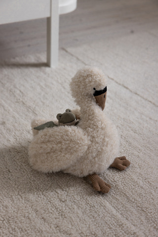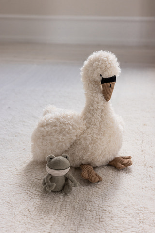 Aktivitetslegetøj, svane fra Sebra er et charmerende og blødt legetøj, der inviterer til både leg og kram. Den fine svane har en blød, krøllet overflade, som stimulerer barnets sanser, og i svanens åbning gemmer sig en lille frø, der kan tages ud og leges med separat. Legetøjet er designet i Sebras velkendte nordiske stil og passer perfekt ind i ethvert børneværelse. Det er ideelt til at fremme barnets motoriske udvikling og fantasi, da barnet kan udforske, røre og lege med de forskellige elementer. Svanen og frøen er skabt med fokus på kvalitet og sikkerhed, så du trygt kan lade dit barn lege og udforske.