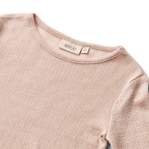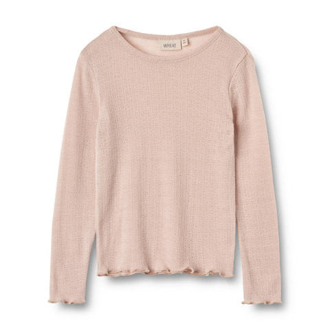 Denne skønne langærmede t-shirt fra Wheat er et must-have til dit barns vintergarderobe. Fremstillet i en blød og behagelig blanding af 85% merinould og 15% silke, tilbyder den både komfort og funktionalitet i én og samme pakke.