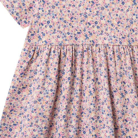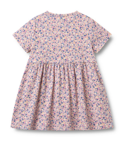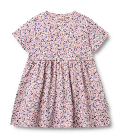 Anna Jersey Kjole fra Wheat er en skøn og behagelig kjole, der kombinerer klassisk design med et moderne blomsterprint. Kjolen er fremstillet i en blød og strækbar jersey-kvalitet, som består af 95% bomuld og 5% elastan, hvilket sikrer en god bevægelsesfrihed og komfort hele dagen. Det fine print med små blomster i pink og blå nuancer giver kjolen et frisk og sommerligt udtryk, der passer perfekt til både hverdag og festlige lejligheder. Kjolen har korte ærmer og en rund hals, hvilket gør den nem at tage af og på, og den lette rynkning i taljen giver et flot fald og en feminin silhuet. Anna Jersey Kjole er ideel til aktive børn, da materialet er åndbart og behageligt mod huden, og elastanen sikrer, at kjolen holder formen vask efter vask. Kjolen kan styles med leggings eller strømpebukser på kølige dage, og er lige så fin alene på varme sommerdage. Wheat er kendt for deres fokus på kvalitet og komfort, og denne kjole er ingen undtagelse – den er designet til at give dit barn frihed til leg og bevægelse, samtidig med at den ser sød og velklædt ud.