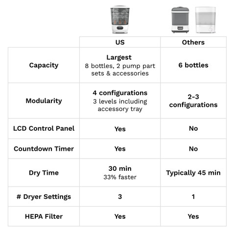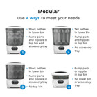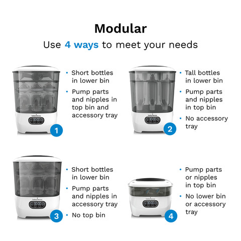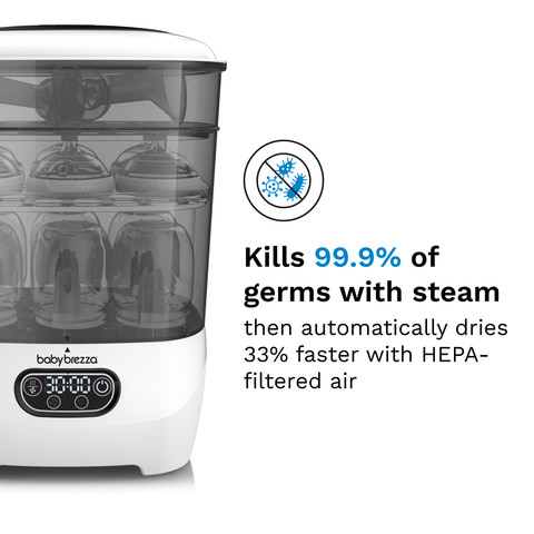 The Baby Brezza Sterilizer Dryer Advanced er den mest avancerede måde at sterilisere og tørre flasker, pumpedele og babytilbehør på. Dette revolutionerende apparat dræber 99,9% af bakterierne med naturlig damp og tørrer derefter automatisk 33% hurtigere. Det har den største kapacitet af alle sterilisatorer og kan rumme 8 flasker, 2 fulde sæt pumpedele, sutteflasker og tilbehør fra ethvert mærke. Og takket være HEPA-filtret tørrer det med 95% bakteriefri luft. Det er også modulært, så du kan bruge det på fire forskellige måder og vælge mellem fire funktioner: Sterilisator og tørretumbler, kun sterilisator, kun tørretumbler eller opbevaringsstativ. Nu kan du sterilisere og tørre dine babyprodukter på den EASY måde! BPA-fri. 2 års garanti.