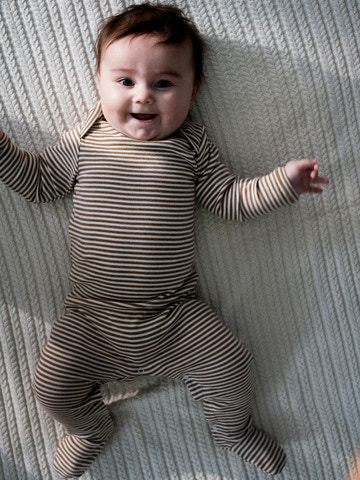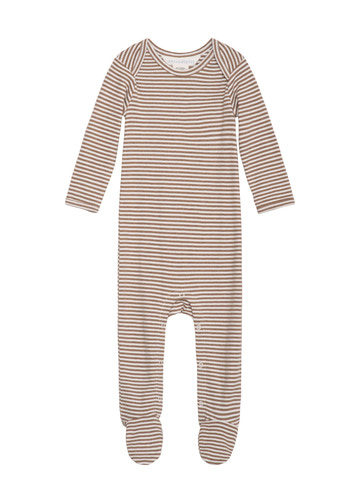 Heldragt med fødder i stribet rib i blød. Konvolutåbning ved skuldrer og trykknapper for åbning i benene. 100% økologisk bomuld.