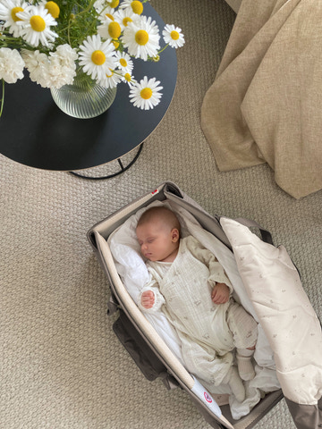 Sørg altid for at placere Carry Me på et fladt underlag, så barnet ikke ruller ud. Dette produkt opfylder de opdaterede krav i den europæiske standard EN 1466:2023 med hensyn til sikkerhed. Efterlad aldrig baby uden opsyn. Det anbefales ikke at bruge dette produkt til samsovning. Læs og følg altid instruktionerne for korrekt brug og advarsler på produktet.