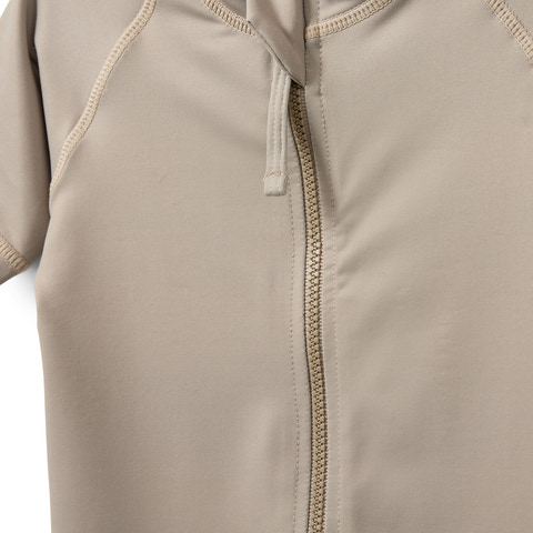 Badedragt med korte ærmer og ben. Dragten har lynlås foran for nem på- og afklædning. Fremstillet i en genanvendt polyesterblanding af 82% genanvendt polyester og 18% spandex for en strækbar og komfortabel pasform.
