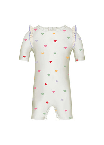 Badeheldragt - Hearts - Cream fra Vanilla COPENHAGEN er den perfekte badedragt til de mindste, der elsker at lege i vandet. Dragten er designet med et charmerende hjerteprint i flere farver på en blød cremefarvet baggrund, hvilket giver et sødt og legende udtryk. De fine rynkedetaljer på skuldrene tilføjer et ekstra feminint touch, og den korte benlængde sikrer god bevægelsesfrihed, så barnet kan boltre sig frit både på stranden og i svømmehallen. Materialet er en blanding af polyamide og elastan, hvilket gør dragten både strækbar og behagelig at have på, samtidig med at den tørrer hurtigt efter badeturen. Badeheldragten er let at tage af og på, og den sidder godt til kroppen uden at stramme. Den er ideel til aktive børn, der har brug for komfort og beskyttelse, når de leger i vandet. Vanilla COPENHAGEN er kendt for deres høje kvalitet og flotte designs, og denne badeheldragt er ingen undtagelse. Den er nem at vedligeholde og holder sig flot vask efter vask, så barnet kan bruge den hele sommeren igennem. Perfekt til både ferie, strandture og svømmetræning.