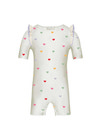 kundeservice@babysam.dkBadeheldragt - Hearts - Cream fra Vanilla COPENHAGEN er den perfekte badedragt til de mindste, der elsker at lege i vandet. Dragten er designet med et charmerende hjerteprint i flere farver på en blød cremefarvet baggrund, hvilket giver et sødt og legende udtryk. De fine rynkedetaljer på skuldrene tilføjer et ekstra feminint touch, og den korte benlængde sikrer god bevægelsesfrihed, så barnet kan boltre sig frit både på stranden og i svømmehallen. Materialet er en blanding af polyamide og elastan, hvilket gør dragten både strækbar og behagelig at have på, samtidig med at den tørrer hurtigt efter badeturen. Badeheldragten er let at tage af og på, og den sidder godt til kroppen uden at stramme. Den er ideel til aktive børn, der har brug for komfort og beskyttelse, når de leger i vandet. Vanilla COPENHAGEN er kendt for deres høje kvalitet og flotte designs, og denne badeheldragt er ingen undtagelse. Den er nem at vedligeholde og holder sig flot vask efter vask, så barnet kan bruge den hele sommeren igennem. Perfekt til både ferie, strandture og svømmetræning.