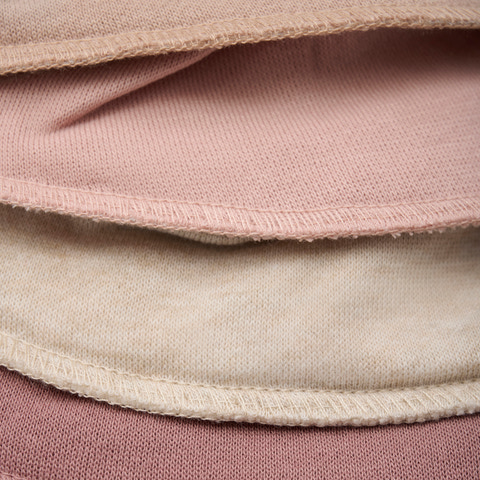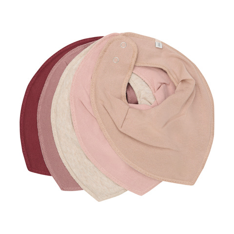 Ensfarvede tørklæde savlesmæk i fine farver som 5-pak i økologisk bomuld og polyester. Smækken består af to lag stof med en membran i midten, der gør dem 100% savletæt. Blødt materiale, som er behagelig for barnet at have på og 2 trykknapper i nakken.