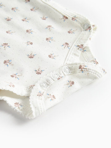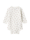 Langærmet bodystocking til nyfødte med slå-om-lukning. Lukkes med trykknapper og bindebånd. Jersey med elastan