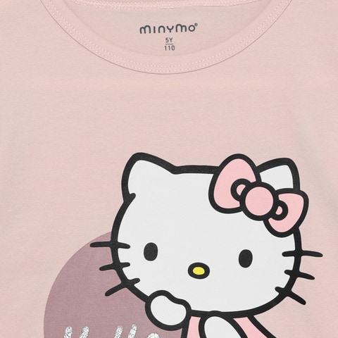 Charmerende bluse fra Minymo i en blød og behagelig lyserød nuance, der emmer af sødme. På fronten ses et fint motiv af den ikoniske Hello Kitty-figur, som tilføjer et legende og genkendeligt touch. Blusen har lange ærmer og en rund halsudskæring med praktiske trykknapper ved den ene skulder, hvilket gør den nem at få af og på. Et stilfuldt valg fra Minymo, der kombinerer komfort med et elsket design til børn.
