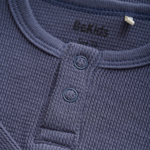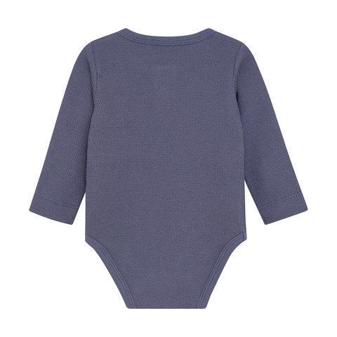 Stilren blå body fra BeKids med klassisk farfarsknapning foran. Fremstillet i blødt og elastisk bomuld, der giver høj komfort hele dagen. Trykknapper i skridtet gør det nemmere at skifte ble. Et tidløst basisplag, der passer lige godt til hverdagen som til lidt finere lejligheder.