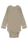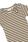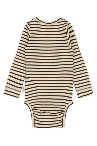 Petit Piao stribet body med de klassiske striber i økologisk bomuld. Striberne er i to farver, hvor bundfarven er en cremefarvet, så striberne beholder sit klassiske look. I halsåbningens venstre side er der en trykknap som gør det nemt at få den over barnets hoved. I bunden er der tre trykknapper, som gør det let at stifte barnet. Ribkvaliteten giver et meget fleksibelt materiale, så barnet har let ved at bevæge sig og lege. Produceret i Indien.