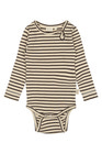 kundeservice@babysam.dkPetit Piao stribet body med de klassiske striber i økologisk bomuld. Striberne er i to farver, hvor bundfarven er en cremefarvet, så striberne beholder sit klassiske look. I halsåbningens venstre side er der en trykknap som gør det nemt at få den over barnets hoved. I bunden er der tre trykknapper, som gør det let at stifte barnet. Ribkvaliteten giver et meget fleksibelt materiale, så barnet har let ved at bevæge sig og lege. Produceret i Indien.