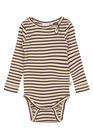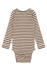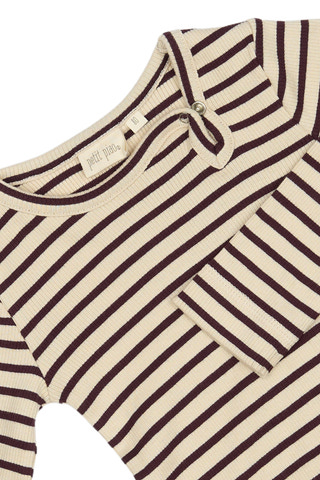 Petit Piao stribet body med de klassiske striber i økologisk bomuld. Striberne er i to farver, hvor bundfarven er en cremefarvet, så striberne beholder sit klassiske look. I halsåbningens venstre side er der en trykknap som gør det nemt at få den over barnets hoved. I bunden er der tre trykknapper, som gør det let at stifte barnet. Ribkvaliteten giver et meget fleksibelt materiale, så barnet har let ved at bevæge sig og lege. Produceret i Indien.