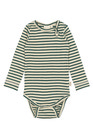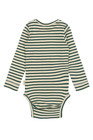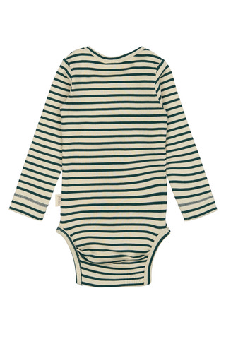 Petit Piao stribet body med de klassiske striber i økologisk bomuld. Striberne er i to farver, hvor bundfarven er en cremefarvet, så striberne beholder sit klassiske look. I halsåbningens venstre side er der en trykknap som gør det nemt at få den over barnets hoved. I bunden er der tre trykknapper, som gør det let at stifte barnet. Ribkvaliteten giver et meget fleksibelt materiale, så barnet har let ved at bevæge sig og lege. Produceret i Indien.