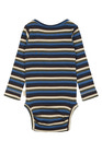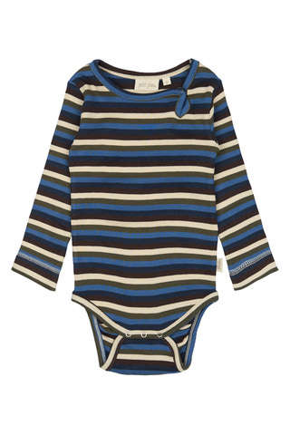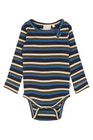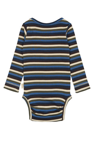 Langærmet body lavet i vores klassiske ribkvalitet med tynde multistriber. På venstre side af halsåbningen har vi vores karakteristiske åbning med en trykknap til nem påklædning. Bodyen lukkes forneden med tre trykknapper for nem bleskift. Materialet er blødt og meget strækbart, designet til komfort og leg.