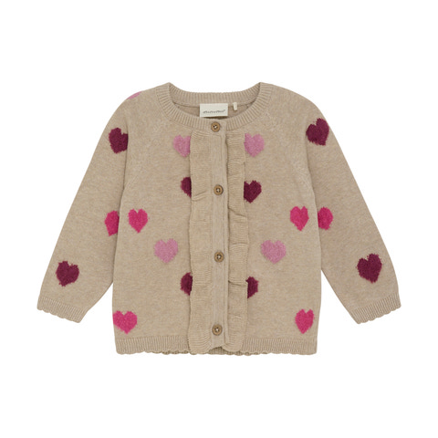Strikket cardigan fra Minymo med fine hjerter og dekorative flæser langs knaplukningen foran. Cardiganen er lavet i en blød og behagelig kvalitet, der giver komfort hele dagen. Den har en klassisk rund hals og ribkanter ved ærmer og nederste kant, som sikrer en god og fleksibel pasform. Et ideelt valg som ekstra lag på kølige dage - eller som et sødt og stilfuldt element til særlige lejligheder.