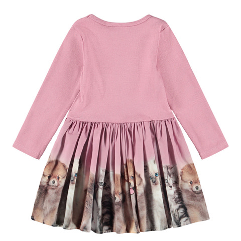 Kjole i økologisk bomuldsjersey med tætsiddende overdel i rib og et let, fyldigt skørt i poplin, der skaber en smuk silhuet. Kjolen lukkes med knap ved skulderen for nem påklædning.