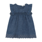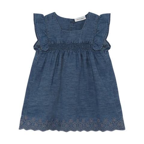 Chambray Kjole fra Minymo i den flotte Faded Denim farve er et skønt valg til både hverdag og festlige lejligheder. Kjolen er designet med fine flæser ved ærmerne, som giver et feminint og legende udtryk. Den elastiske smock ved brystet sikrer en behagelig pasform, så barnet frit kan bevæge sig og lege. Nederst på kjolen er der en smuk broderet kant med blomstermønster, som tilføjer et ekstra touch af elegance. Kjolen er let og luftig, hvilket gør den ideel til de varme måneder, men den kan også styles med strømpebukser og en cardigan på køligere dage. Chambray-materialet har et denim-look, men er blødere og mere behageligt mod huden, hvilket gør kjolen komfortabel hele dagen. Den lukkes nemt på ryggen med små knapper, så den er let at tage af og på.