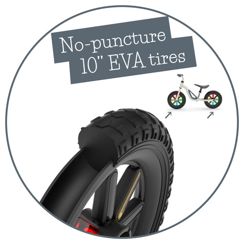 Takket være den lette ramme kan dit barn nemt kontrollere cyklen, og i kombination med det integrerede bærehåndtag gør det det også nemt for os forældre at bære den. De lysende hjul er en ekstra sjov faktor og giver ekstra synlighed, når man kører. De punkterfri 10-tommer EVA-dæk er virkelig komfortable: ingen grund til at pumpe dækkene op længere, ingen punkteringsrisiko, fra nu af kun sjov!