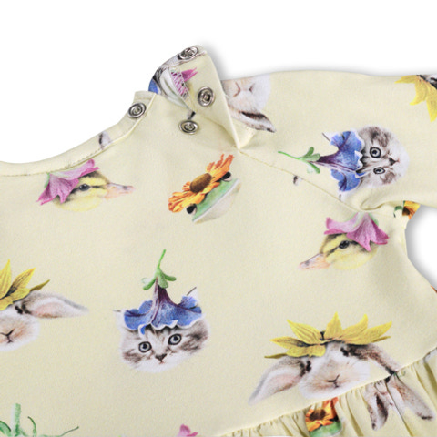 Charmaine Kjole fra Molo er en yndig og komfortabel kjole til de mindste. Kjolen er fremstillet i blød økologisk bomuld med et strejf af elastan, hvilket sikrer en behagelig pasform og god bevægelsesfrihed. Det søde print med blomster og små dyremotiver gør kjolen ekstra charmerende og velegnet til både hverdag og særlige anledninger. Kjolen har lange ærmer og en let rynket skørt, som giver et flot fald og et feminint udtryk. Den er nem at tage af og på, og materialet føles blødt mod barnets hud, så komforten altid er i top.