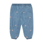 Charmbray Bukser fra Minymo i farven Faded Denim er et skønt valg til hverdagsgarderoben. Bukserne er lavet i en blød og let denimkvalitet, der føles behagelig mod huden og giver masser af komfort til leg og bevægelse. De fine broderede blomsterdetaljer tilfører et sødt og feminint udtryk, mens elastikken i taljen og ved anklerne sikrer, at bukserne sidder godt uden at stramme. Den afslappede pasform gør dem perfekte til både dagpleje og hyggestunder derhjemme. Et par alsidige bukser, der nemt kan styles med både t-shirts og bluser.