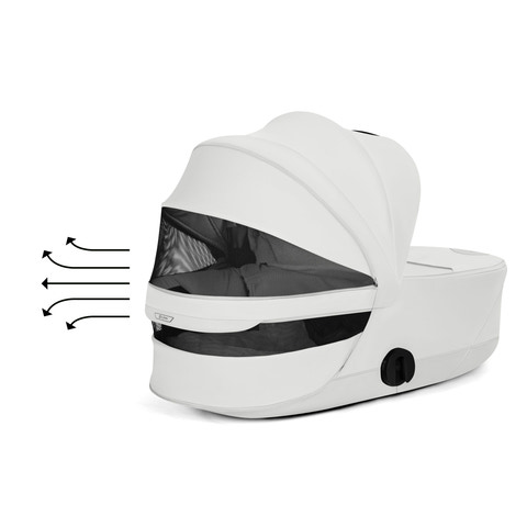 Når det er tid til opbevaring, gør det innovative design det muligt at folde liggedelen til halv størrelse, også selv mens den stadig er fastgjort til Priam stellet - hurtigt, problemfrit og kompakt. På længere rejser kan den afmonteres med én hånd og foldes sammen separat fra stellet, så den passer perfekt i bilens bagagerum eller i flyets bagagekabine (sørg altid for at spørger flyskelskabet). En åndbar madras i blødt skum omslutter dit barn med nænsom støtte, mens panorama- og ovenlys "vinduer" lukker lys og frisk luft ind - og giver små nysgerrige øjne mulighed for at udforske verden. Hver eneste detalje er gennemtænkt: luksuriøs søvnkomfort, banebrydende design og rejsefrihed uden kompromiser. Designet til forældre, der forventer førsteklasses detaljer, kvalitet og design.