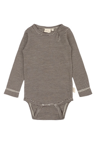 Denne langærmede body i blød merinould er designet med fine striber og fokus på både komfort og funktionalitet. Ved venstre side af halsåbningen finder du vores karakteristiske trykknap, som gør det nemt at tage bodyen af og på. Nederst lukkes den med tre praktiske trykknapper, der gør bleskift hurtigt og nemt. Det strækbare og bløde materiale giver maksimal bevægelsesfrihed – perfekt til aktive småbørn.