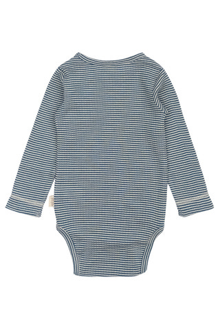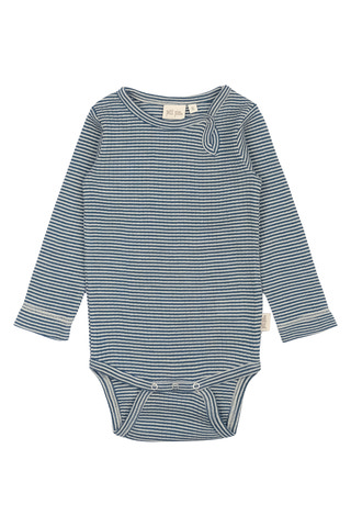 Denne langærmede body i blød merinould er designet med fine striber og fokus på både komfort og funktionalitet. Ved venstre side af halsåbningen finder du vores karakteristiske trykknap, som gør det nemt at tage bodyen af og på. Nederst lukkes den med tre praktiske trykknapper, der gør bleskift hurtigt og nemt. Det strækbare og bløde materiale giver maksimal bevægelsesfrihed – perfekt til aktive småbørn.