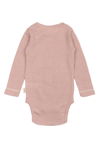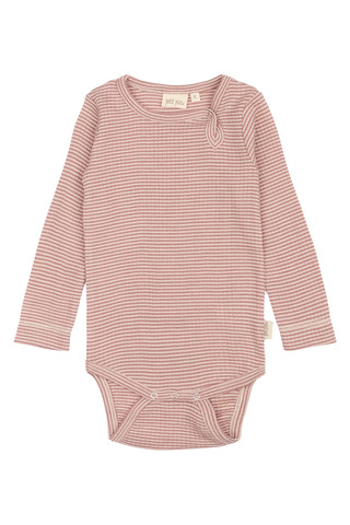 Denne langærmede body i blød merinould er designet med fine striber og fokus på både komfort og funktionalitet. Ved venstre side af halsåbningen finder du vores karakteristiske trykknap, som gør det nemt at tage bodyen af og på. Nederst lukkes den med tre praktiske trykknapper, der gør bleskift hurtigt og nemt. Det strækbare og bløde materiale giver maksimal bevægelsesfrihed – perfekt til aktive småbørn.