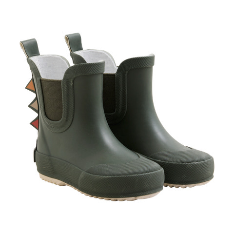 Lave og ensfarvede gummistøvler med dinosaur detaljer på hælen fra CeLaVi. Gummistøvlerne er lavet i naturgummi og har en refleksstribe bagpå. Der anbefales et voksetillæg på 1 1/2 cm.