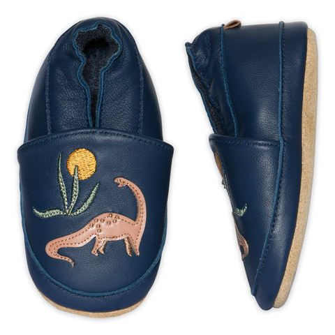 Hjemmefutter fra MELTON i blødt læder, med elastisk kant. Futternes overdel er i læder og dekoreret med en dinosaur, mens foringen er i bomulds frotté. Futterne har udtagelige såler.