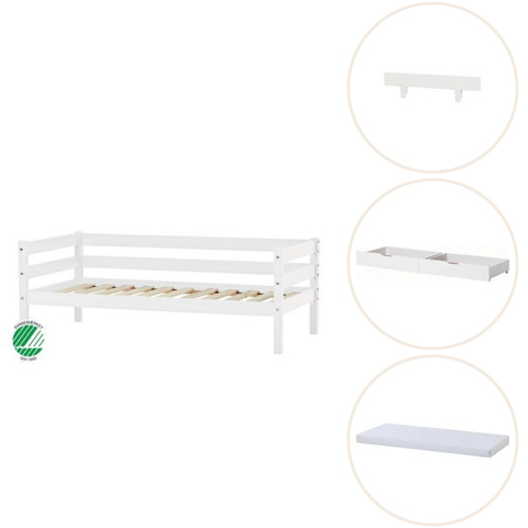 kundeservice@babysam.dkECO Comfort juniorsengen fra Hoppekids er en sød og praktisk seng i størrelsen 70x160 cm. Den egner sig perfekt som en mellemstation mellem babysengen og voksensengen. Hoppekids laver mange senge og muligheder heriblandt denne enkle og flotte ECO Comfort juniorseng. Med en madras størrelse på 70x160 cm. er denne juniorseng et godt valg når barnet skal ud af tremmesengen og videre til en større, men ikke er helt klar til en voksen størrelse seng. Sengen er en lille fin og hyggelig seng, som danner en tryg base for barnet gennem mange år, og sikre en dejlig natte søvn. Den smarte sengehest gør det let og hurtigt at forvandle sengen fra legeseng til trygt sovested. Sengehesten kan nemlig let tages af eller sættes på efter behov. Sengehesten kan også skrues fast, hvis der er behov for en stærkere eller mere permanent løsning. De store, praktiske skuffer fra Hoppekids er perfekt til opbevaring af sengetøj eller legesager. Skufferne har praktiske gummihjul, så de er lette at trille ud fra under sengen.