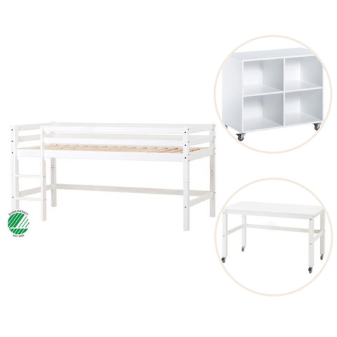 kundeservice@babysam.dkMed denne seng fra Hoppekids får man både ECO Dream juniorsengen og et modul så den kan bygges til en smart og sej halvhøj seng. Sengen giver mere gulvplads til leg og mulighed for at lave en hyggelig hule under sengen. Med en størrelse på hele 90x200 cm. bliver Hoppekids juniorsengen en god base til barnet for en god og tryg nattesøvn. Denne fine og enkle halvhøj juniorseng fra Hoppekids giver mange muligheder og er derfor mere end bare en seng. ECO Dream halvhøj seng er en smart seng til dem der virkelig ønsker at have lege eller opbevaringsplads under sengen. Hvis behovet opstår hvor der ikke er brug for en halvhøj seng, er det lige til og enkelt at lave den om til en juniorseng - sengen er nemlig delbar. Den store størrelse 90x200 cm giver masser af plads til at vokse på og barnet kan bruge sengen helt indtil de er klar til et teenageværelse. Størrelsen giver samtidig mulighed for at en forælder kan ligge i sengen, fx hvis der skal læses godnathistorie. Med mulighed for disse løsninger, betyder det at sengen vokser med barnets og dets behov. Rumdeleren i størrelse 62,5x69 cm. er en praktisk reol med fire store rum og hjul med låsefunktion. Det giver god fleksibilitet i indretningen, uden at gå på kompromis med sikkerheden. Den store flade oven på reolen er perfekt til fx byggeklodser, mens rummene kan bruges til udstilling eller som dukkehus. Hjulene gør det nemt at flytte rundt på reolen, så den kan indgå som en aktiv del af legen eller bruges til fleksibel opdeling af rummet. Skrivebordet er en praktisk og god arbejdsplads til børneværelset. Den store bordplade på 115x62,5 cm. giver masser af plads til både lektier og kreative udfoldelser. Bordet har fire lås bare hjul, som gør det nemt at flytte rundt med, uden at gå på kompromis med stabiliteten og sikkerheden.