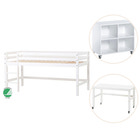 Med denne seng fra Hoppekids får man både ECO Dream juniorsengen og et modul så den kan bygges til en smart og sej halvhøj seng. Sengen giver mere gulvplads til leg og mulighed for at lave en hyggelig hule under sengen. Med en størrelse på hele 90x200 cm. bliver Hoppekids juniorsengen en god base til barnet for en god og tryg nattesøvn. Denne fine og enkle halvhøj juniorseng fra Hoppekids giver mange muligheder og er derfor mere end bare en seng. ECO Dream halvhøj seng er en smart seng til dem der virkelig ønsker at have lege eller opbevaringsplads under sengen. Hvis behovet opstår hvor der ikke er brug for en halvhøj seng, er det lige til og enkelt at lave den om til en juniorseng - sengen er nemlig delbar. Den store størrelse 90x200 cm giver masser af plads til at vokse på og barnet kan bruge sengen helt indtil de er klar til et teenageværelse. Størrelsen giver samtidig mulighed for at en forælder kan ligge i sengen, fx hvis der skal læses godnathistorie. Med mulighed for disse løsninger, betyder det at sengen vokser med barnets og dets behov. Rumdeleren i størrelse 62,5x69 cm. er en praktisk reol med fire store rum og hjul med låsefunktion. Det giver god fleksibilitet i indretningen, uden at gå på kompromis med sikkerheden. Den store flade oven på reolen er perfekt til fx byggeklodser, mens rummene kan bruges til udstilling eller som dukkehus. Hjulene gør det nemt at flytte rundt på reolen, så den kan indgå som en aktiv del af legen eller bruges til fleksibel opdeling af rummet. Skrivebordet er en praktisk og god arbejdsplads til børneværelset. Den store bordplade på 115x62,5 cm. giver masser af plads til både lektier og kreative udfoldelser. Bordet har fire lås bare hjul, som gør det nemt at flytte rundt med, uden at gå på kompromis med stabiliteten og sikkerheden.