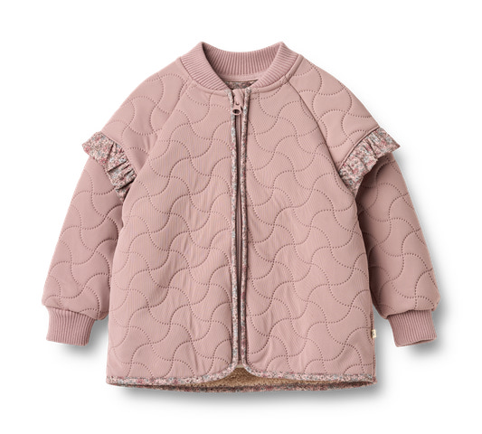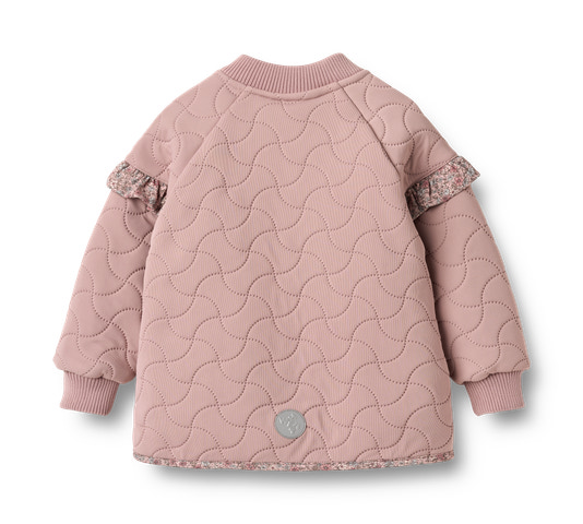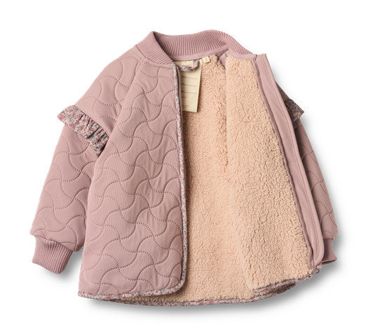 Termojakke med plysfor, flæser og printdetaljer til din baby. Wheat's populære termotøj til baby er en ægte hverdagsfavorit, da det bløde og lette materiale gør det behageligt at bevæge sig og lege i. Termojakken er fremstillet af 100% genanvendt polyester og kan bruges som et hyggeligt lag indendørs eller som praktisk overgangsovertøj. Den er ikke vandtæt, men vandafvisende og egner sig til fugtigt vejr.