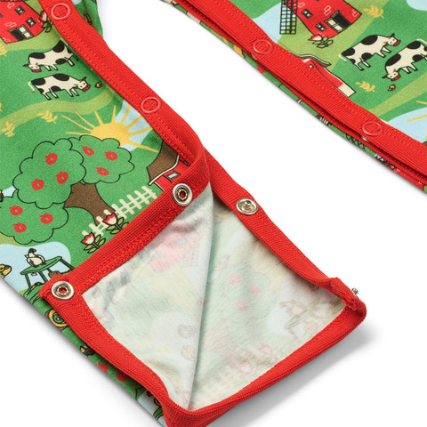 Elstar Heldragt - Bondegård - Green fra Småfolk er den perfekte heldragt til de mindste, der elsker farver og sjove motiver. Dragten er fremstillet i blød og behagelig bomuld, som sikrer, at dit barn kan bevæge sig frit og komfortabelt hele dagen. Det charmerende bondegårdsprint i grønne nuancer med røde detaljer og søde dyr gør dragten ekstra indbydende og sjov for barnet at have på. Heldragten har lange ærmer og ben, hvilket gør den ideel til både dag- og nattetid, og den er nem at tage af og på takket være de praktiske trykknapper ved skulder og mellem benene. Småfolk er kendt for deres høje kvalitet og børnevenlige designs, og denne heldragt er ingen undtagelse. Perfekt til både leg og afslapning, og den kan nemt vaskes, så den altid er klar til brug. En skøn gaveidé til de mindste, der elsker eventyrlige motiver og komfortabelt tøj.