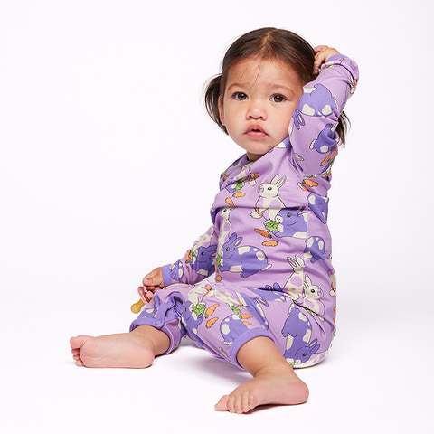 Elstar Heldragt - Kaniner - Floral fra Småfolk er en skøn heldragt til de mindste, der kombinerer komfort og legende design. Heldragten er fremstillet i blød bomuld, som føles behagelig mod barnets hud og sikrer optimal bevægelsesfrihed hele dagen. Det søde print med kaniner og blomster i lilla nuancer gør dragten ekstra charmerende og perfekt til både hverdag og hyggestunder. Heldragten har lange ærmer og ben, hvilket gør den ideel til både dag og nat, og den praktiske åbning med trykknapper gør det nemt at skifte ble eller tage dragten af og på. Småfolk er kendt for deres farverige og fantasifulde designs, og denne heldragt er ingen undtagelse – den bringer glæde og komfort til både barn og forældre. Dragten kan nemt kombineres med andre styles fra Småfolk for et fuldendt look. Perfekt som gave eller til at forkæle dit eget barn med noget ekstra lækkert.