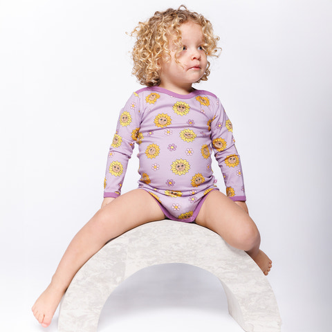Langærmet baby body med solsikker produceret i en økologisk og strækbar bomuldsjersey. Denne body er OEKO-TEX Standard 100® certificeret, hvilket betyder at denne body er produceret og testet for skadelige stoffer, så du kan passe på dit barns hud og helbred.Denne body har en normal pasform med kuvertlukning og trykknapper, samt ribkant i hals og ærmer. Småfolks body'er er designet i Danmark med tanke på at kunne holde til utallige eventyrer og leg, og bevare form og farver selv efter gentagen brug. Modellen på billedet er ca. 83 cm lang og har størrelse 80 cm på.