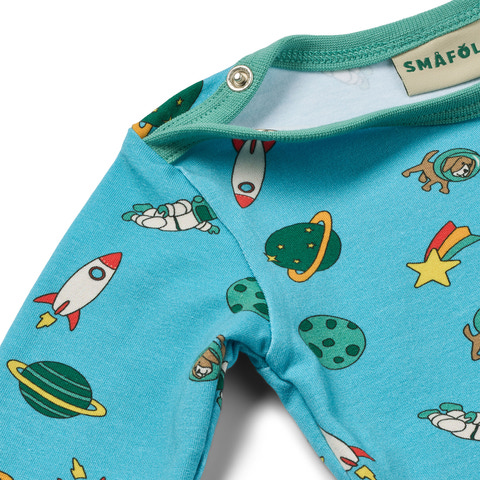 Langærmet baby body med universet produceret i en økologisk og strækbar bomuldsjersey. Denne body er OEKO-TEX Standard 100® certificeret, hvilket betyder at denne body er produceret og testet for skadelige stoffer, så du kan passe på dit barns hud og helbred.Denne body har en normal pasform med kuvertlukning og trykknapper, samt ribkant i hals og ærmer. Småfolks body'er er designet i Danmark med tanke på at kunne holde til utallige eventyrer og leg, og bevare form og farver selv efter gentagen brug. Modellen på billedet er ca. 81 cm lang og har størrelse 80 cm på.