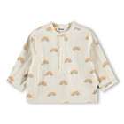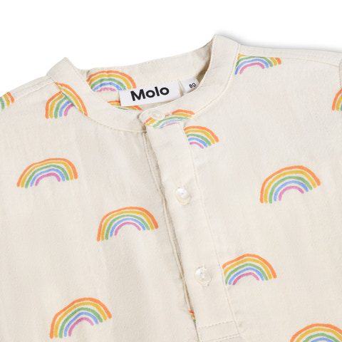 Enozo Skjorte fra Molo er en skøn skjorte i 100% bomuld, der kombinerer komfort og stil til de mindste. Skjorten har et charmerende all-over print med små regnbuer, som giver et legende og farverigt udtryk. Den klassiske kinakrave og knaplukning foran gør skjorten nem at tage af og på, mens den løse pasform sikrer, at barnet kan bevæge sig frit og ubesværet. Perfekt til både hverdag og festlige lejligheder, hvor der ønskes et ekstra pift til garderoben. Molo er kendt for deres kreative designs og høje kvalitet, hvilket gør denne skjorte til et sikkert valg for både børn og forældre.