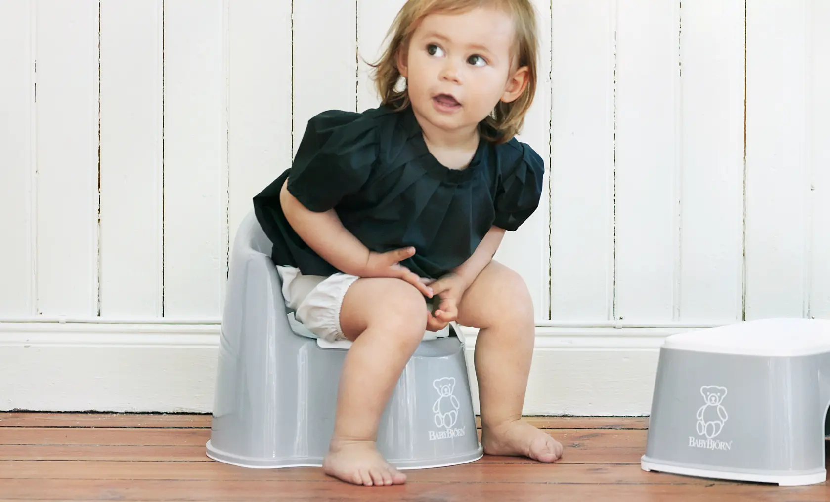 Hvis I starter med toilettet, er det vigtigt at anskaffe et lille toiletsæde med en skammel til fødderne.
