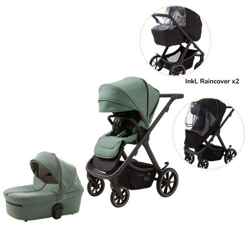 Lang kaleche som let klappes sammen med magneter. Lygte i kalechen, samt refleksbånd og stor ventilation. Lommer indvendigt i kalechen. Bærehåndtag - maks. 9 kg. Polstret så den passer til det nordiske klima. Lynlås i forlæderet. Let montering på stellet. Fidlock montering af forlæder. Madras medfølger. Madrassen har to forskellige sider - en sommer og vinter. Passer fra nyfødt til ca. 6 mdr. - liggemål 76 cm.